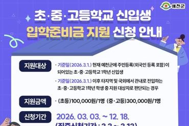 예천군, 2026년 초·중·고 신입생 입학준비금 지원 사업 추진