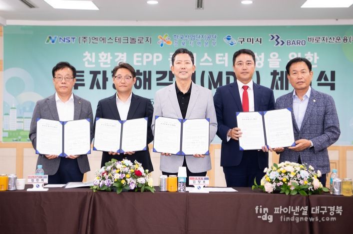 파이낸셜대구경북 신영숙 기자 | 구미시는 8월 25일 시청 대회의실에서 ㈜NS테크놀로지, 한국산업단지공단 경북지역본부, 바로자산운용㈜과 함께 구미국가 3산업단지 내 ‘EPP(발포 폴리프로필렌) 클러스터’ 조성을 위한 투자양해각서(MOU)를 체결했다.