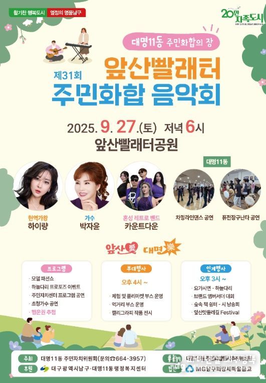 파이낸셜대구경북 김유신 기자 | 대구 남구 대명11동 행정복지센터는 주민과 함께하는 문화축제로 오는 9월 27일 오후 6시에 앞산빨래터공원에서 ‘제31회 앞산빨래터 주민화합 음악회’를 개최한다.
