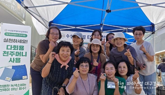 천주머니에는 수성구 캐릭터 ‘뚜비’ 라벨을 회원들이 직접 부착했으며, 시민들에게 배포하며 일회용 비닐봉투 사용을 줄이기 위한 홍보 활동을 전개했다.