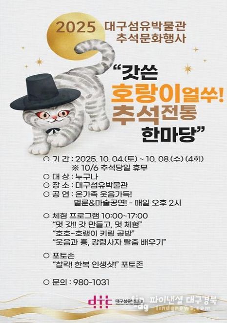 파이낸셜대구경북 김유신 기자 | 대구섬유박물관은 10월 4일부터 10월 8일까지(추석 당일 휴관) 추석 문화행사 ‘갓 쓴 호랑이랑 얼쑤!‘를 개최한다.