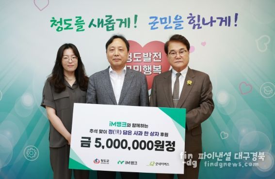 IM뱅크 청도지점 오창용 지점장은 “명절 준비에 어려움을 겪는 이웃들에게 조금이나마 보탬이 되고자 이번 나눔에 동참하게 되었으며, 앞으로도 다양한 사회공헌 활동을 통한 지역사회와 상생의 길을 모색하겠다”고 말했다.