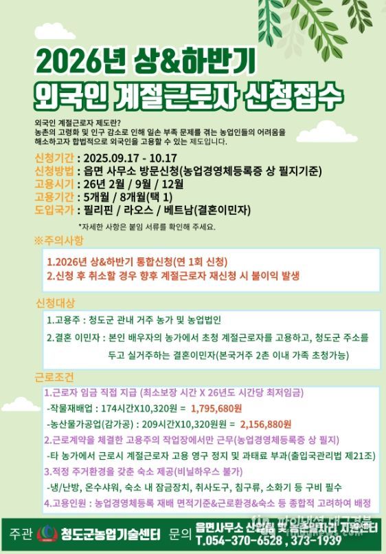 파이낸셜대구경북 김유신 기자 | 청도군은 농촌 인구감소와 고령화로 인한 농번기 일손 부족 문제 해소를 위해 9월 17일부터 10월 17일까지 '2026년 상·하반기 외국인 계절근로자' 고용 희망농가 수요조사를 실시하고 있다.