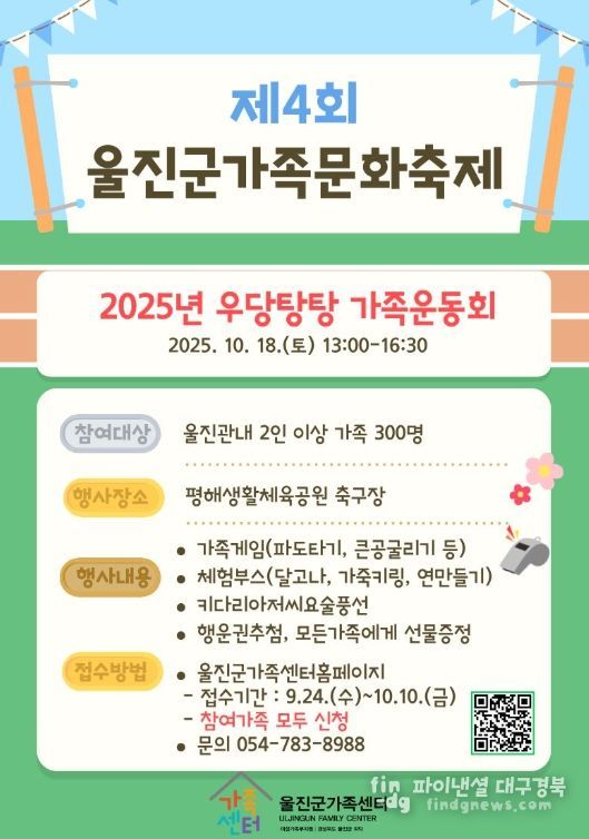 파이낸셜대구경북 이지원 기자 | 울진군은 울진군가족센터가 오는 10월 18일 오후 1시부터 평해생활체육공원 축구장에서 제4회 울진군가족문화축제‘우당탕탕 가족운동회’를 개최한다.