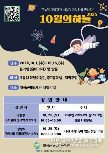 김재욱 칠곡군수는 “10월의 하늘 과학 강연이 청소년들에게 미래 과학자로 성장할 꿈의 씨앗이 되길 바라며, 도서관이 새로운 배움과 영감을 전하는 장으로 다양한 프로그램을 이어가겠다” 전했다.