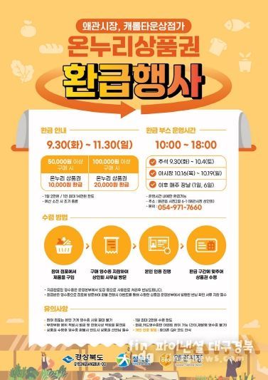 파이낸셜대구경북 기자 | 칠곡군은 전통시장 활성화와 지역경제 활력 제고를 위해 9월 30일(화)부터 11월 30일(일)까지 전통시장 구매 고객을 대상으로 온누리상품권 환급행사를 진행한다.