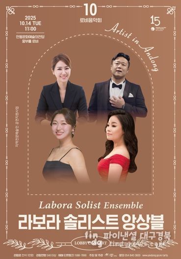 파이낸셜대구경북 기자 | 안동문화예술의전당은 지역예술인들에게 다양한 무대 경험을 제공하고, 시민에게는 일상 속 음악 향유의 기회를 선사하기 위해 매월 첫째 주 화요일 오전 11시 로비음악회 시리즈를 진행하고 있다. 오는 10월 14일 오전 11시, '라보라 솔리스트 앙상블'이 안동문화예술의전당 웅부홀 로비에서 열린다.