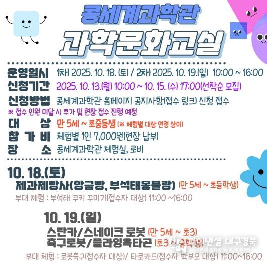 최수영 기술지원과장은 “과학문화교실을 통해 아이들이 과학에 흥미를 느끼고, 자신의 적성에 맞는 진로를 탐색하는 계기가 되길 바란다”며 “많은 어린이와 청소년의 참여를 기대한다”고 말했다.