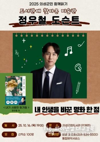 파이낸셜대구경북 김유신 기자 | 의성군은 오는 10월 16일 의성군립도서관에서 정우철 도슨트를 초청해 '내 인생을 바꾼 명화 한 점'을 주제로 저자강연을 개최한다고 밝혔다.