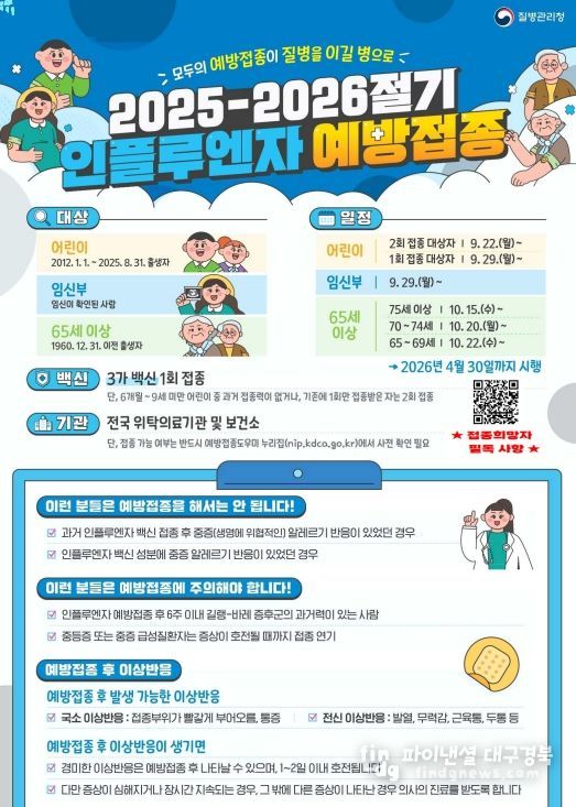 인플루엔자 국가예방접종 대상은 생후 6개월~13세 이하 어린이(2012년 1월 1일~2025년 8월 31일 출생자), 임신부, 65세 이상 어르신(1960년 12월 31일 이전 출생자)이다.