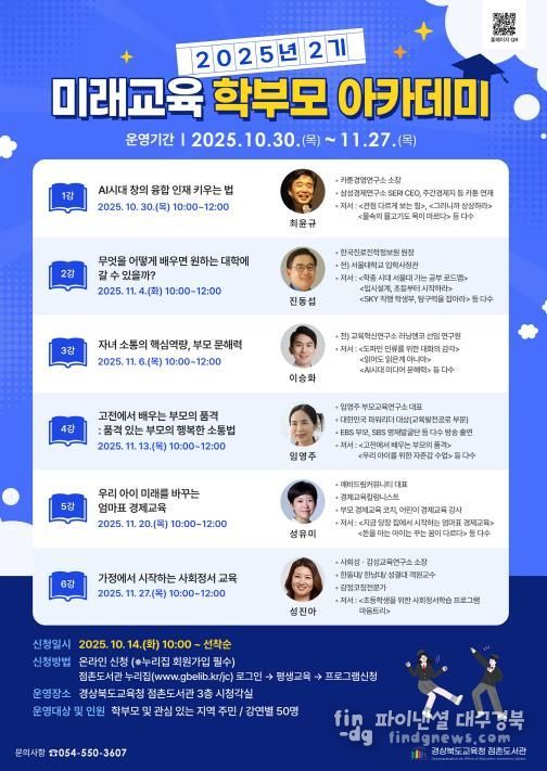 파이낸셜대구경북 기자 | 경상북도교육청 점촌도서관은 10월 30일부터 11월 27일까지 학부모 및 일반인을 대상으로 2025년 2기'미래교육 학부모 아카데미'를 운영한다.