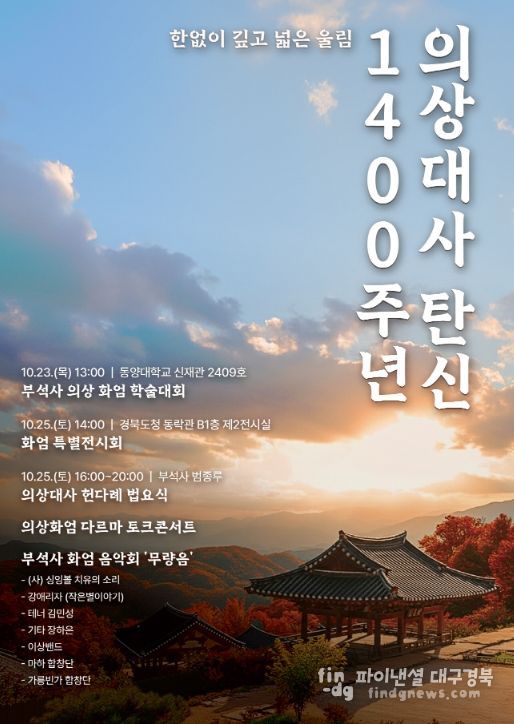조종근 문화예술과장은 “이번 의상대사 탄신 1400주년 기념행사는 그의 사상을 재조명하고, 화엄의 세계관을 현대적으로 해석하는 학문적·문화적 의미를 지닌 자리가 될 것”이라며 “의상대사가 창건하신 부석사에서 행사를 개최하게 되어 매우 뜻깊으며, 시민과 관광객이 함께하는 의미 있는 문화축제가 되길 바란다”고 말했다.