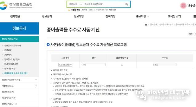파이낸셜대구경북 김유신 기자 | 경북교육청은 전국 최초로 ‘정보공개 사본 수수료 자동 계산 프로그램’을 자체 개발해 본청과 교육지원청, 직속기관 누리집에 구축을 완료했다고 16일 밝혔다.