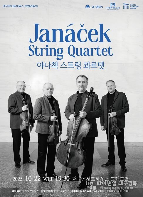 파이낸셜대구경북 김유신 기자 | (재)대구문화예술진흥원 대구콘서트하우스는 2025년 한-체코 수교 35주년을 맞아, 체코 정통 실내악의 깊이를 전하는 세계적인 현악4중주단 ‘야나첵 스트링 콰르텟(Janáček String Quartet)’의 내한공연을 오는 10월 22일 오후 7시 30분, 대구콘서트하우스 그랜드홀에서 개최한다.