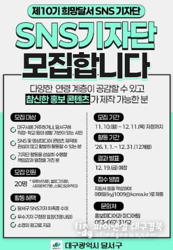 파이낸셜대구경북 김유신 기자 | 대구 달서구는 구민이 직접 참여해 지역의 소식을 생생하게 전하는 제10기 ‘희망달서 SNS기자단’을 오는 **12월 11일**까지 모집한다.