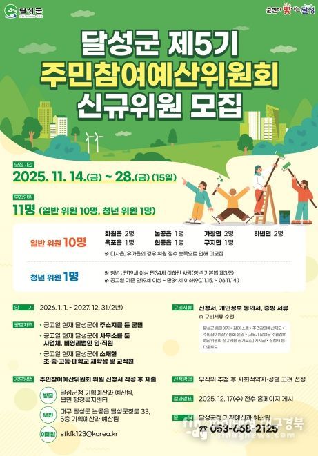 파이낸셜대구경북 김유신 기자 | 달성군은 11월 14일부터 28일까지 제5기 주민참여예산위원회 신규위원 11명을 모집한다.