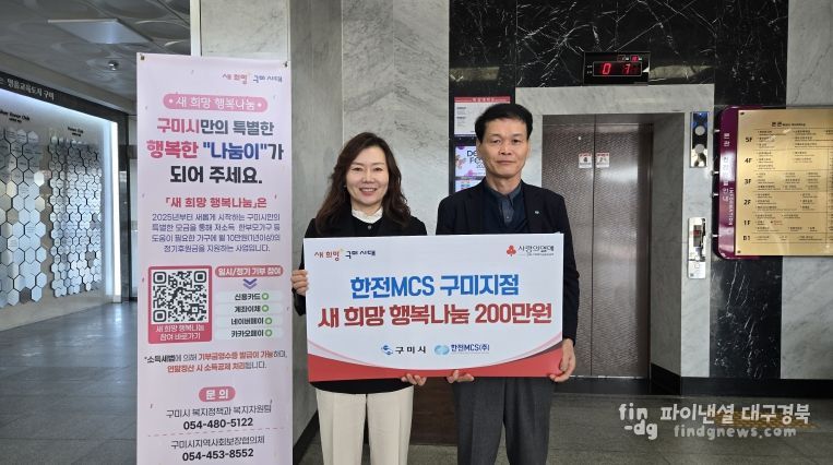 파이낸셜대구경북 김유신 기자 | 구미시는 지난 18일 한전MCS 구미지점(지점장 정경우)으로부터 '새 희망 행복나눔' 성금 200만원을 기탁받았다.