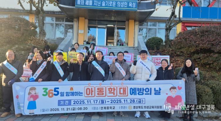파이낸셜대구경북 기자 | 경상북도교육청 의성교육지원청은 2025년 11월 21일 오전, 안계중학교 정문 앞에서 아동 학대에 대한 경각심을 고취하고 학생들의 안전하고 행복한 생활을 위해 아동학대 예방 캠페인을 실시했다.