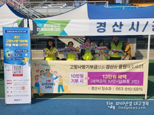 파이낸셜대구경북 기자 | 경산시는 23일 경산시민운동장에서 시작하여 경산시 일대를 돌아오는 2025 삼성현 전국 마라톤대회에서 경산 고향사랑기부제 홍보를 실시했다.