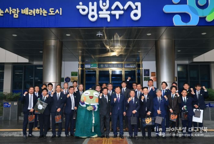 파이낸셜대구경북 김유신 기자 | 대구 수성구는 지난 25일 일본 오사카부 이즈미사노시의 마세 미치히로 부시장과 킨노 야스유키 상공회의소 회장을 비롯한 경제인 대표단 30명이 수성구청을 방문했다고 밝혔다.