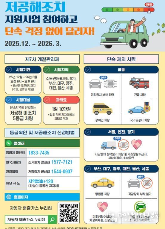 파이낸셜대구경북 김유신 기자 | 대구광역시는 12월 1일부터 내년 3월 말까지 4개월간 ‘제7차 미세먼지 계절관리제’ 시행에 따라 배출가스 5등급 차량에 대한 운행제한을 실시한다.