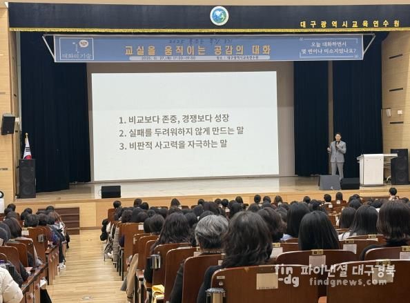파이낸셜대구경북 김유신 기자 | 대구교육연수원은 11월 27일 대구교육연수원 대강당에서 교원 및 교육전문직원 400여 명을 대상으로 ‘교실을 움직이는 공감의 대화'를 주제로‘2025 톡 쏘는 특강(3기)’을 진행했다.