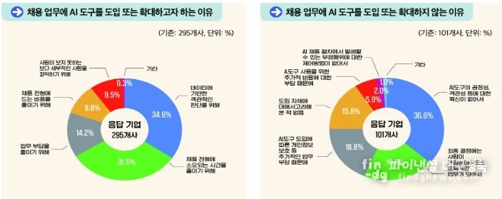 반면에, 도입·확대 계획이 없는 25.5%(101개사) 기업은 ‘AI 도구의 공정성, 객관성 등에 대한 확신이 없어서’(36.6%), ‘최종 결정에는 사람이 개입해야 하므로 중복적인 업무가 되어서’(19.8%)를 주요 이유로 들었는데, 이를 통해 AI 도구의 ‘객관성·공정성·효율성’에 대한 상반된 시각을 확인할 수 있었다.