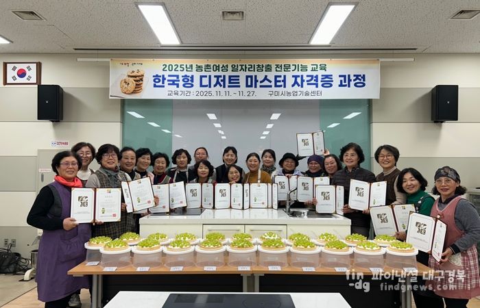 파이낸셜대구경북 기자 | 구미시는 농촌여성의 경제활동 참여 확대와 일자리 창출을 목표로 올해 상·하반기 전문기능교육을 운영해 ‘노인실버건강지도사’와 ‘한국형 디저트 마스터’ 2개 자격증 과정을 성공적으로 마무리했다.
