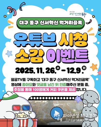 이달 26일부터 12월 9일까지 진행되는 ‘홍보영상 유튜브 시청 이벤트’는 동구청 유튜브에서 ‘신서혁신 먹거리골목 홍보 영상’을 시청하고 감상평을 남긴 후 이벤트 참여 사이트를 통해 응모 가능하다.