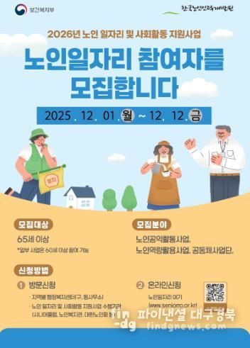 파이낸셜대구경북 김유신 기자 | 김천시는 오는 12월 1일부터 12월 12일까지 2주간 노인일자리 및 사회활동 지원사업 참여자를 모집한다고 밝혔다.