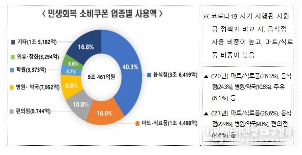 업종별 사용은 대중음식점(40.3%, 3조 6,419억원), 마트·식료품(16.0%, 1조 4,498억원), 편의점(10.8%, 9,744억원), 병원·약국(8.8%, 7,952억원), 학원(3.7%, 3,373억원), 의류·잡화(3.6%, 3,294억원) 순으로 이루어졌다.