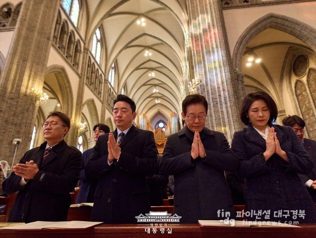 파이낸셜대구경북 김유신 기자 | 이재명 대통령과 김혜경 여사가 25일 서울 중구 명동대성당에서 열린 성탄 대축일 미사에서 기도를 하고 있다.