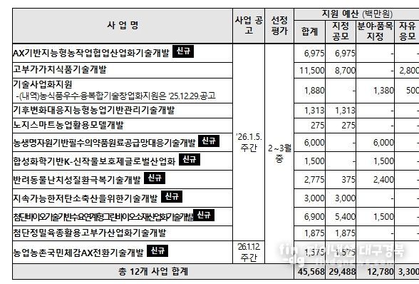파이낸셜대구경북 기자 | 농림축산식품부는 1월 5일, 2026년도 농식품부 연구개발사업의 지원사업․내용․대상․일정 등을 담은 연구개발사업 시행계획을 통합 공고한다고 밝혔다.