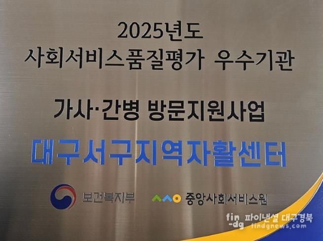 파이낸셜대구경북 김유신 기자 | 대구 서구지역자활센터는 보건복지부 주관 2025년 가사·간병 방문지원사업 품질 평가에서 전국 349개소 중 상위 9개소에 해당하는‘우수 기관’으로 선정됐다.