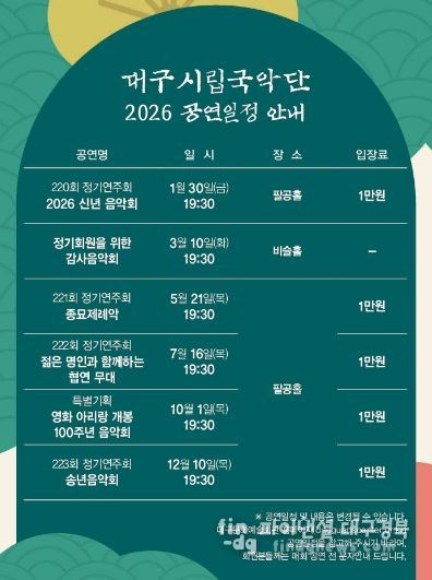 파이낸셜대구경북 김유신 기자 | 대구시립국악단은 전통문화예술을 활성화하고 시민들에게 보다 폭넓은 문화 혜택을 제공하고자 2026년 연간 정기회원을 모집한다.