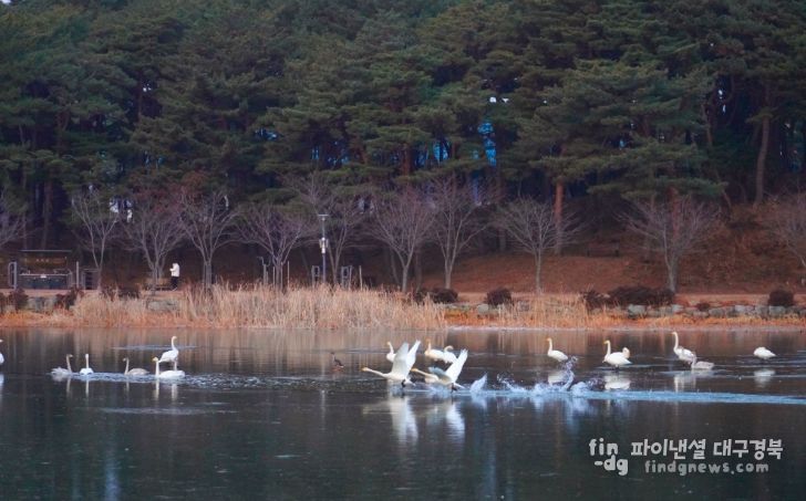 파이낸셜대구경북 기자 | 맑게 갠 하늘 아래 울진군 연호공원에서 겨울 철새 고니가 힘차게 날아오르고 있다.