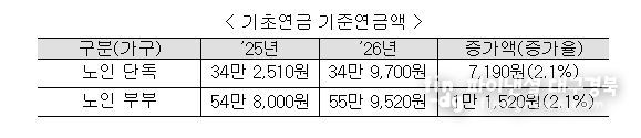 한편, 기초연금 기준연금액 역시 기초연금법에 따라 전년도 소비자물가상승률 2.1%를 반영하여, 2025년 34만 2,510원에서 2026년 34만 9,700원으로 늘어난다. 올해 기초연금을 받는 약 779만 명의 어르신들은 1월부터 인상된 기초연금액을 지급받게 되며, 기초연금 기준연금액의 인상을 위해 관련 고시를 1월 중 개정할 계획이다.