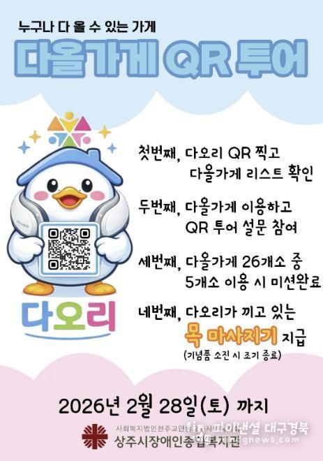 파이낸셜대구경북 기자 | 상주시장애인종합복지관은 1월 2일부터 2월 28일까지 지역 내 무장애 상가 이용을 활성화하기 위한‘다올가게 QR 투어’ 캠페인을 진행한다.
