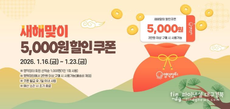 행사는 이달 16일부터 23일로, 이 기간 영덕장터 회원 중 선착순 1,000명에게 영덕군 농특산물 5,000원 할인 쿠폰이 지급한다.