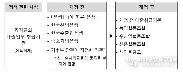이번 개정안은 재생에너지 정책융자 취급기관(현재 15개 기관)에 지역과 밀접한 4개 금융기관 추가를 주요 내용으로 하고 있다.