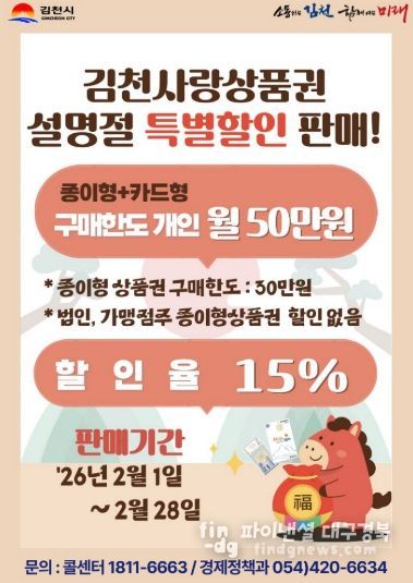 파이낸셜대구경북 기자 | 김천시는 오는 설 명절을 앞두고 2월 한달간 김천사랑상품권을 15% 특별 할인 판매하여 지역 소비 활성화에 나선다.