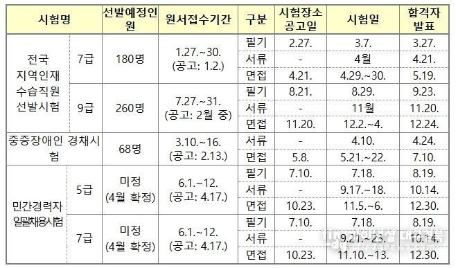 인사처에서 주관하는 경채 시험의 원서접수 일정은 오는 27일 7급 지역인재 선발을 시작으로 ▲3월 10일 중증장애인 선발 ▲6월 1일 5·7급 민간경력자 일괄채용 ▲7월 27일 9급 지역인재 선발 순으로 진행된다.