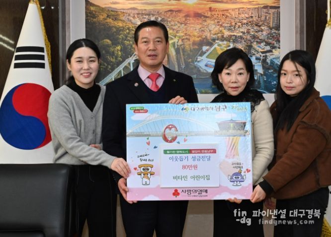파이낸셜대구경북 김유신 기자 | 대구 남구 국공립 비타민어린이집에서는 지난 1월 29일 남구청을 방문하여 이웃돕기 성금 80만원을 기탁했다.