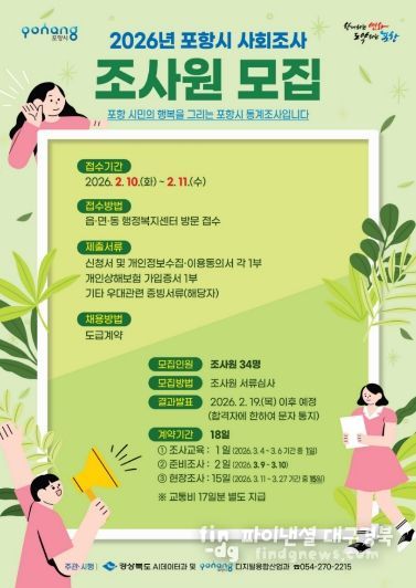 파이낸셜대구경북 기자 | 포항시는 ‘2026년 경상북도 및 포항시 사회조사’에 참여할 조사원 34명을 모집한다.