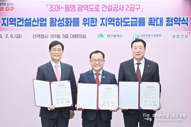 파이낸셜대구경북 기자 | 대구광역시는 2월 6일오후 2시 시청 산격청사에서 ‘조야~동명 광역도로건설 2공구’ 공사에 수반되는 하도급의 지역업체 참여 비율 확대를 위해 금호건설㈜, 대한전문건설협회 대구시회와 3자 협약을 체결했다.