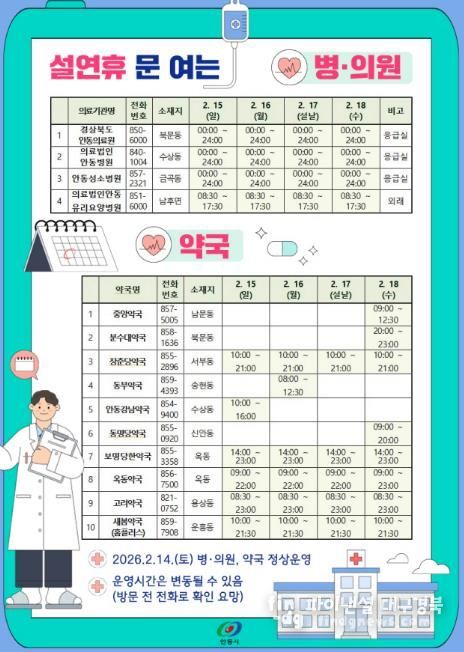 파이낸셜대구경북 김유신 기자 | 안동시는 설 연휴 기간인 2월 14일부터 18일까지 5일간, 시민이 건강하고 안전하게 연휴를 보낼 수 있도록 응급진료체계를 구성․운영한다.
