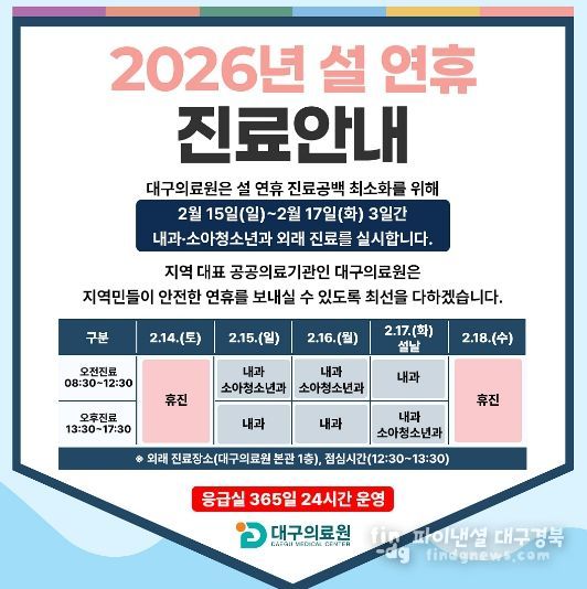 대구의료원은 설 연휴를 대비해 2월 15일부터 17일까지 3일간 지역의 진료 공백 해소를 위해 내과·소아청소년과 전문의 외래 진료를 시행한다.