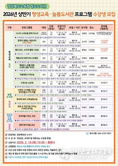 파이낸셜대구경북 기자 | 경상북도교육청 청도도서관(관장 조은희)은 2월 19일부터 지역주민을 대상으로 2026년 상반기 평생교육 및 늘봄도서관 프로그램 수강생을 모집한다.