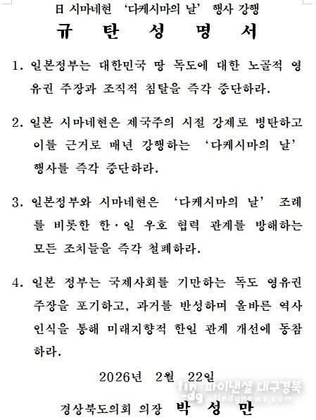 파이낸셜대구경북 김유신 기자 | 경상북도의회는 일본 시마네현이 2월 22일 이른바 ‘다케시마의 날’ 행사를 개최한 데 대해 깊은 유감을 표명하며, 독도에 대한 부당한 인식을 담고 있는 ‘다케시마 조례’의 즉각적인 폐기를 촉구하는 성명을 발표했다.
