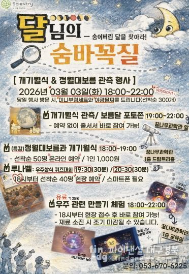 파이낸셜대구경북 김유신 기자 | 국립대구과학관은 개기월식과 정월대보름을 기념해 3월 3일 ‘개기월식·정월대보름 관측행사: 달님의 숨바꼭질’을 개최한다.